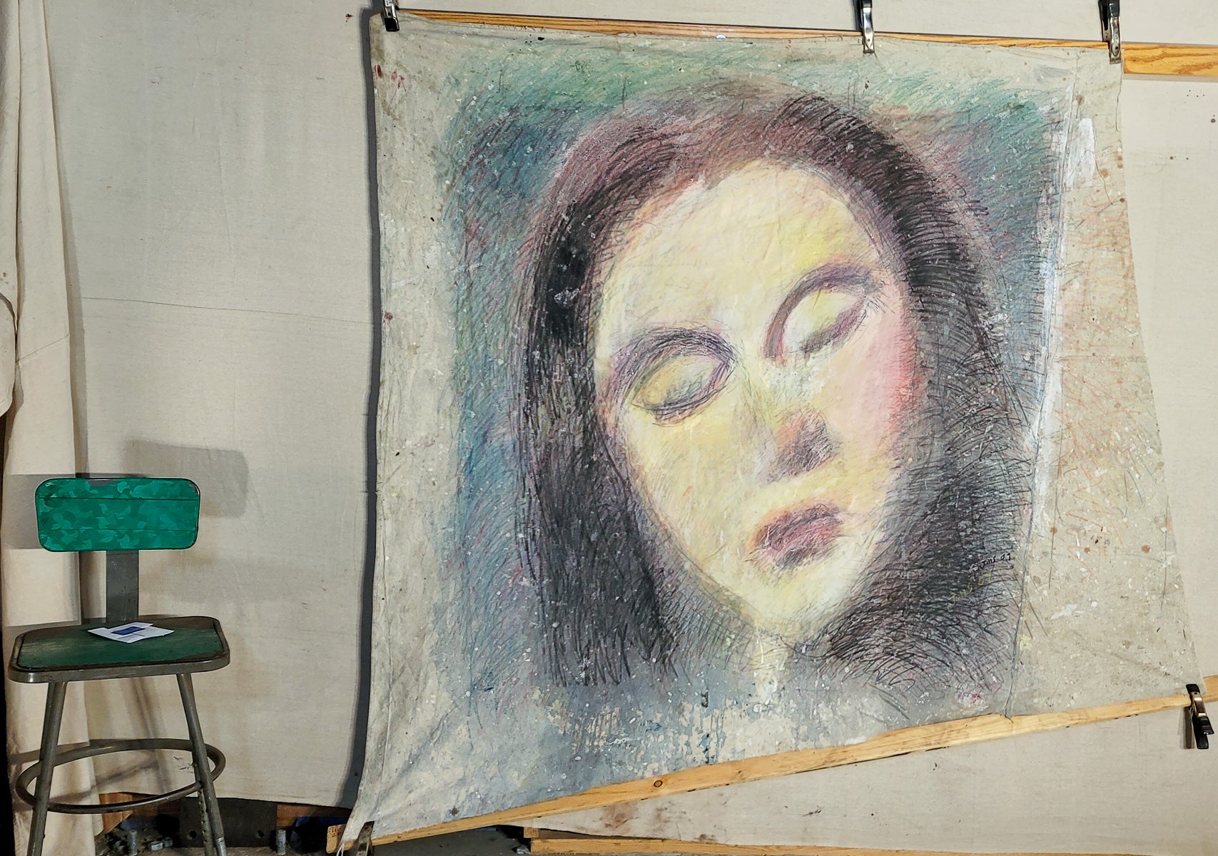 Soft, blended colors—mainly pastels like light yellows, pinks, and greens—creates a gentle, dreamlike atmosphere. Rough, textured strokes and layered approach bring depth and motion to the face, adding emotional complexity to the image. The raw, un-stretched canvas reinforces an organic, intimate, and expressive quality.