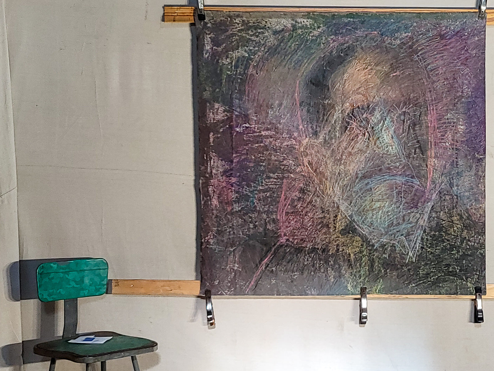 This self-portrait by Jon Sarkin has a textured, abstract quality with rough, colorful strokes that form an indistinct, haunting face. The palette of muted purples, greens, and blues gives the piece a dreamlike, ethereal feel,